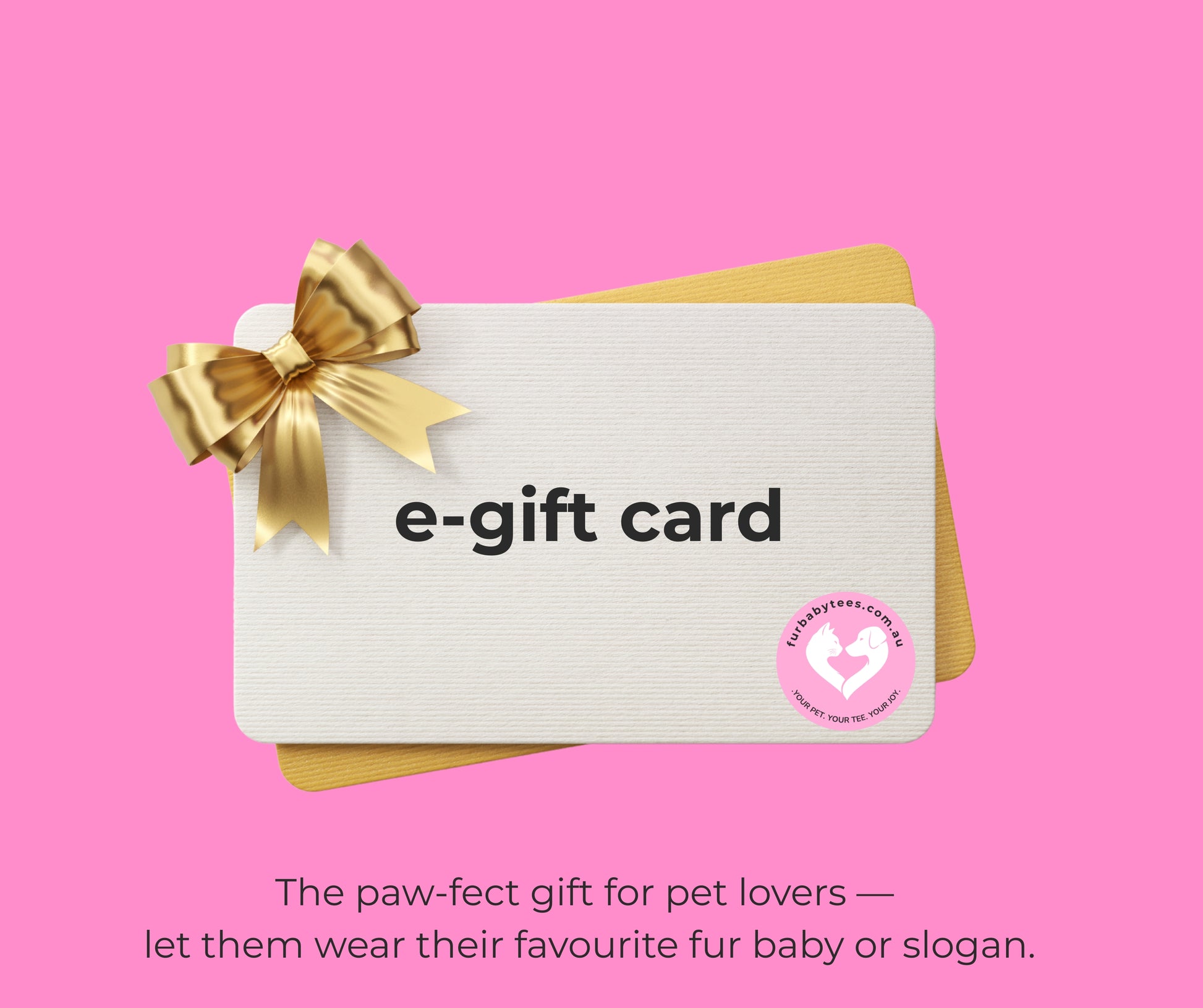 Give the gift of choice with a FurbabyTees E-Gift Card — perfect for pet parents, gift-givers, and anyone obsessed with their furry (or feathered!) best friend.
